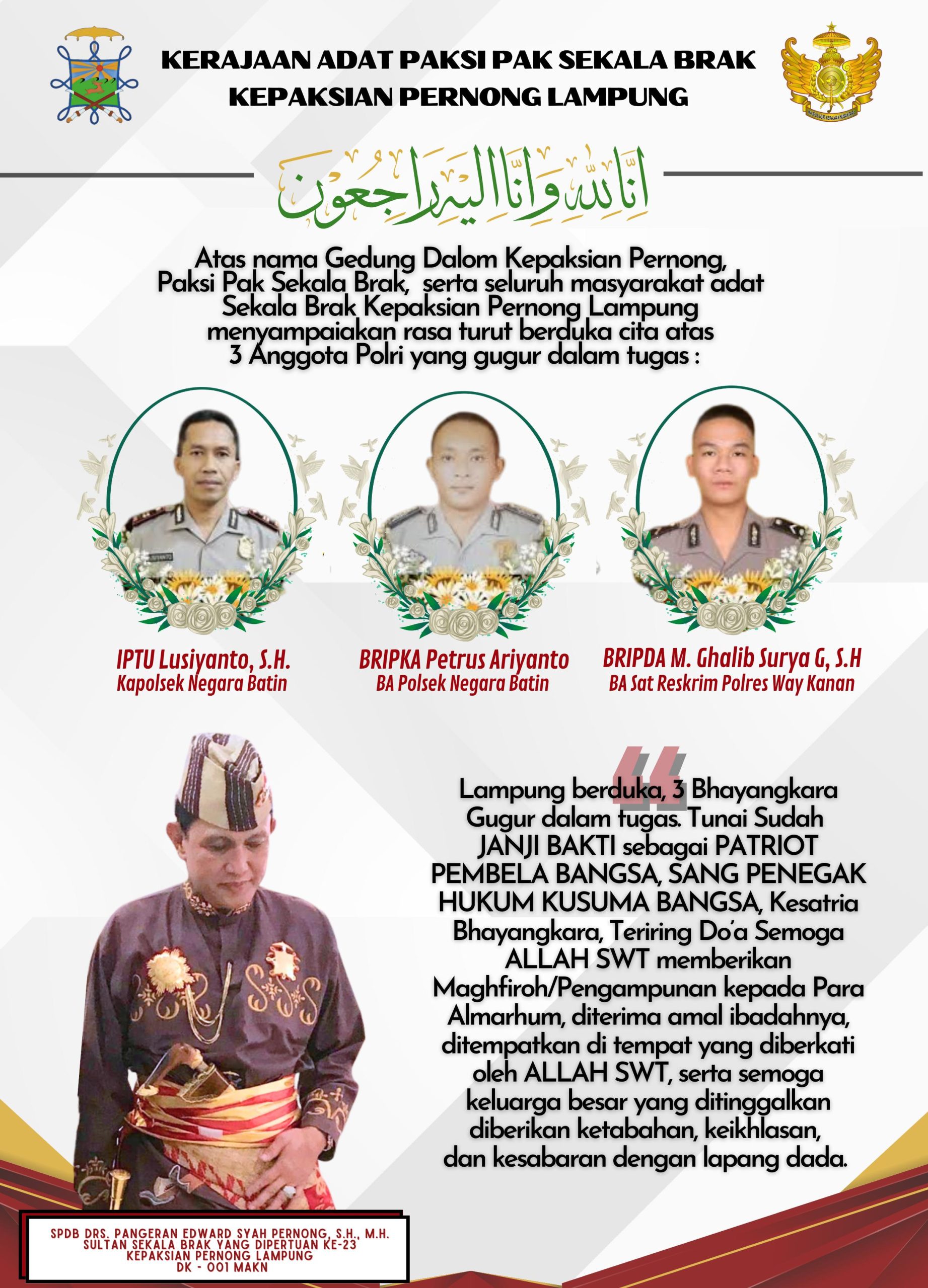 LAMPUNG (+62) – PYM SPDB Pangeran Edward Syah Pernong, Sultan Sekala Brak yang Dipertuan Ke-23, Kepaksian Pernong Lampung, beserta keluarga besar Kerajaan Adat Paksi Pak Sekala Brak Kepaksian Pernong Lampung, serta seluruh Keluarga besar yang ada disepanjang Pesisir tanah Lampung, menyampaikan rasa turut berduka cita yang mendalam atas gugurnya tiga Bhayangkara Polres Way Kanan dalam tugas.