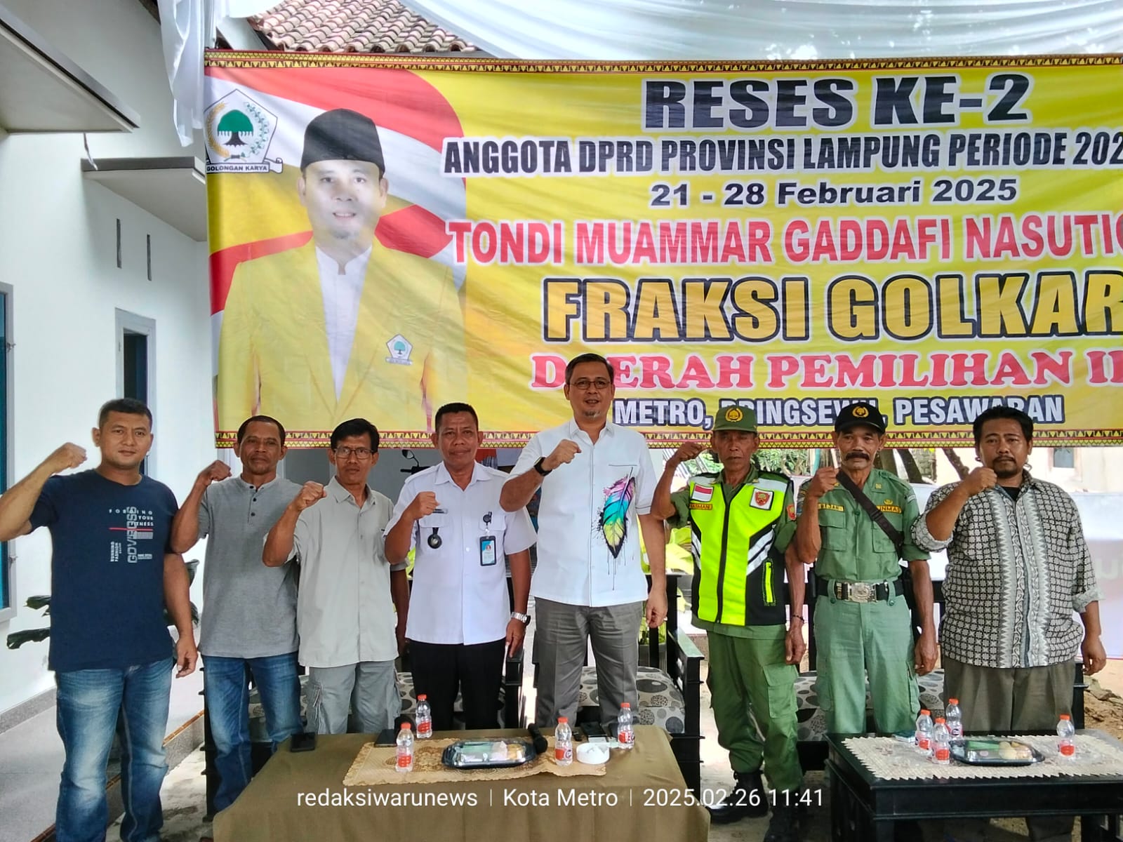 Kota Metro-(berita+62)-Usulan pembangunan infrastruktur dari warga, mendominasi dalam reses Anggota DPRD Provinsi Lampung, Daerah Pemilihan 3 (Kota Metro, Pesawaran, Pringsewu) Fraksi Golkar, Tondi Muamar Gaddafi. Usulan warga menjadi catatan penting dan menjadi bahan pokok pikiran dewan, masuk dalam program tahun anggaran 2026.