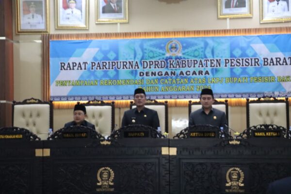 PESIBAR- Bupati-Wakil Bupati Pesisir Barat (Pesibar), Dedi Irawan – Irawan Topani, S.H., M.Kn., menghadiri rapat paripurna Dewan Perwakilan Rakyat Daerah (DPRD) dengan agenda Penyampaian Rekomendasi DPRD Terhadap Laporan Keterangan Pertanggungjawaban (LKPJ) Bupati Tahun Anggaran 2024, di ruang rapat paripurna DPRD Pesibar, Senin (14/4/2025).