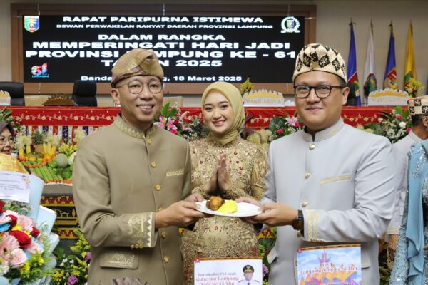 BANDARLAMPUNG- Rapat Paripurna Istimewa DPRD Lampung dalam rangka Memperingati Hari Jadi Provinsi Lampung ke-61 di Ruang Sidang DPRD Provinsi Lampung, Selasa (18/3/2025), berlangsung penuh semangat kebersamaan. Gubernur Lampung Rahmat Mirzani Djausal memotivasi seluruh komponen masyarakat mewujudkan visi “Bersama Lampung Maju Menuju Indonesia Emas”.