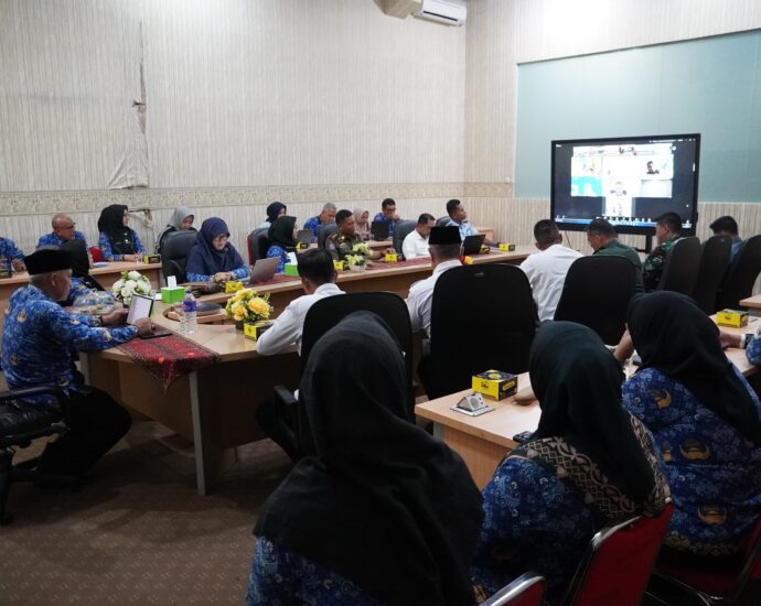 BANDAR LAMPUNG- Staf Ahli Gubernur Bidang Ekonomi, Keuangan dan Pembangunan, Zainal Abidin mengikuti Rapat Koordinasi Pengendalian Inflasi Daerah dan Persiapan Angkutan Lebaran 2025 secara virtual di Command Center Lt.2, Senin (17/2/2025).