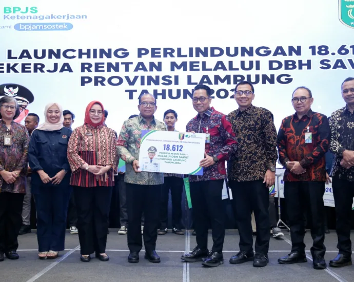 BANDAR LAMPUNG – Penjabat Gubernur Lampung Samsudin melakukan peluncuran program Jaminan Sosial Ketenagakerjaan (Jamsostek) bagi Pekerja Rentan melalui Dana Bagi Hasil (DBH) Sawit bertempat di Hotel Novotel, Kamis (26/09/2024).