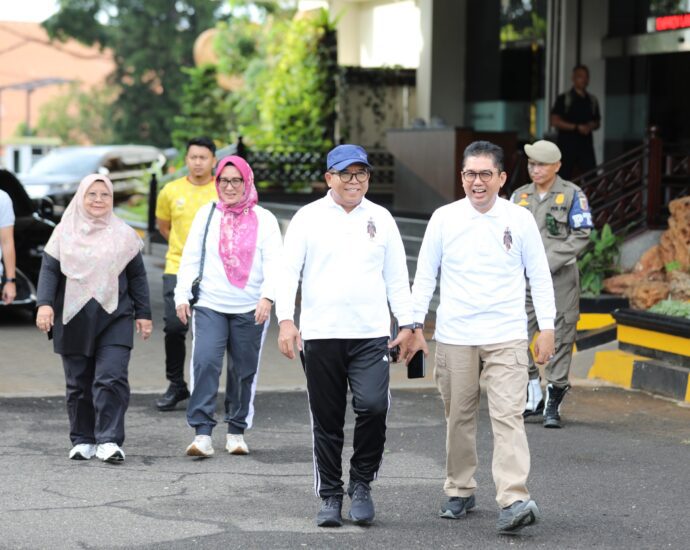 BANDARLAMPUNG – Pj. Gubernur Lampung Samsudin, didampingi Pj. Ketua TP-PKK Provinsi Lampung Maidawati Retnoningsih Samsudin, menyampaikan “salam perpisahan” kepada jajaran Pejabat Pimpinan Tinggi Pratama dan seluruh Aparatur Sipil Negara (ASN) di Lingkungan Pemerintah Provinsi Lampung, usai mengikuti kegiatan senam bersama di Lapangan Korpri, Kantor Gubernur Lampung, Bandarlampung, Jumat (14/2/2025).