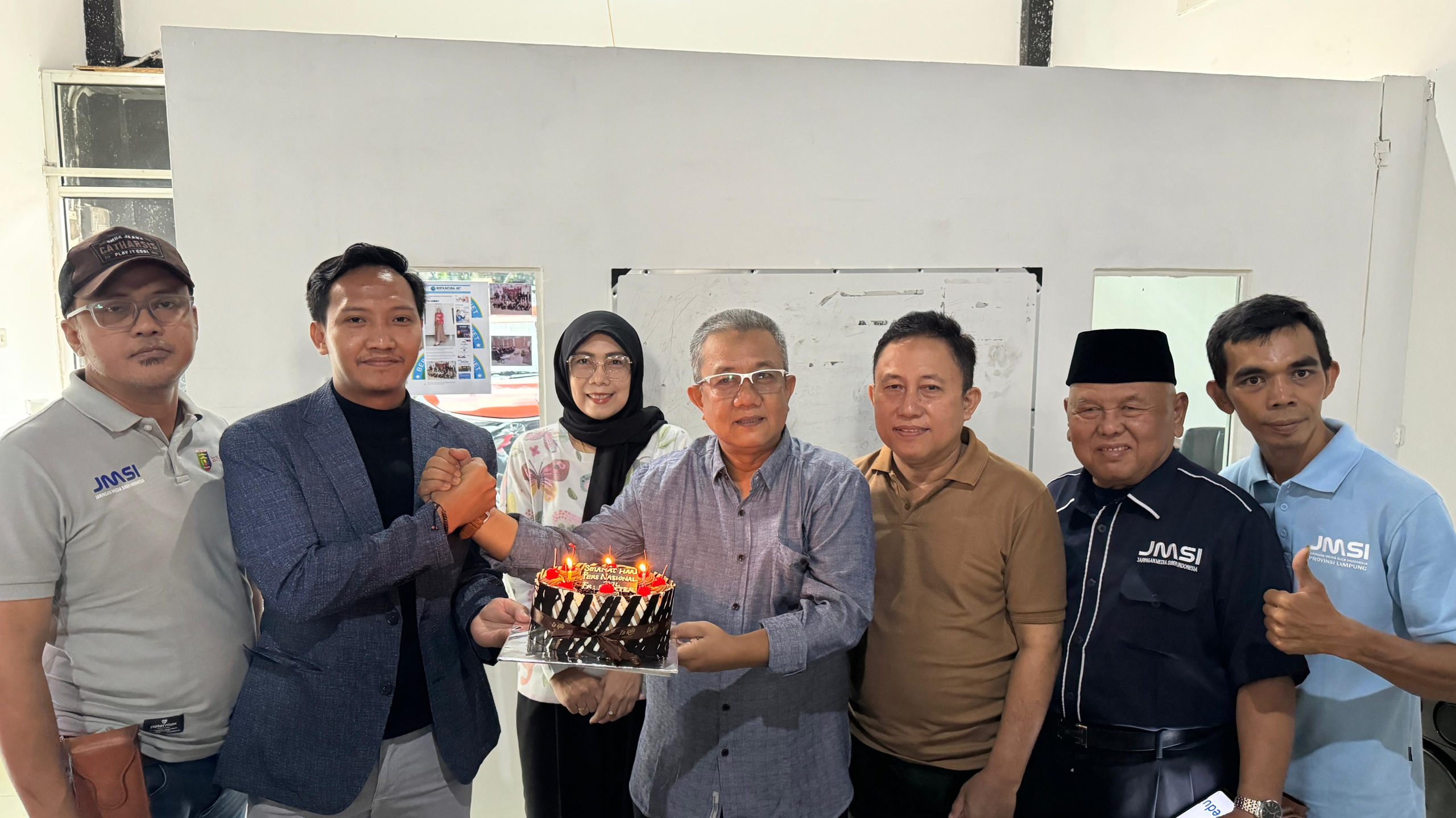 Ketua JMSI Lampung Ahmad Novriwan terkejut dengan kedatangan Bagian management Tol Bakter yang membawa Kue Ulang tahun untuk memperingati HUT JMSI dan HPN tahun 2025.
