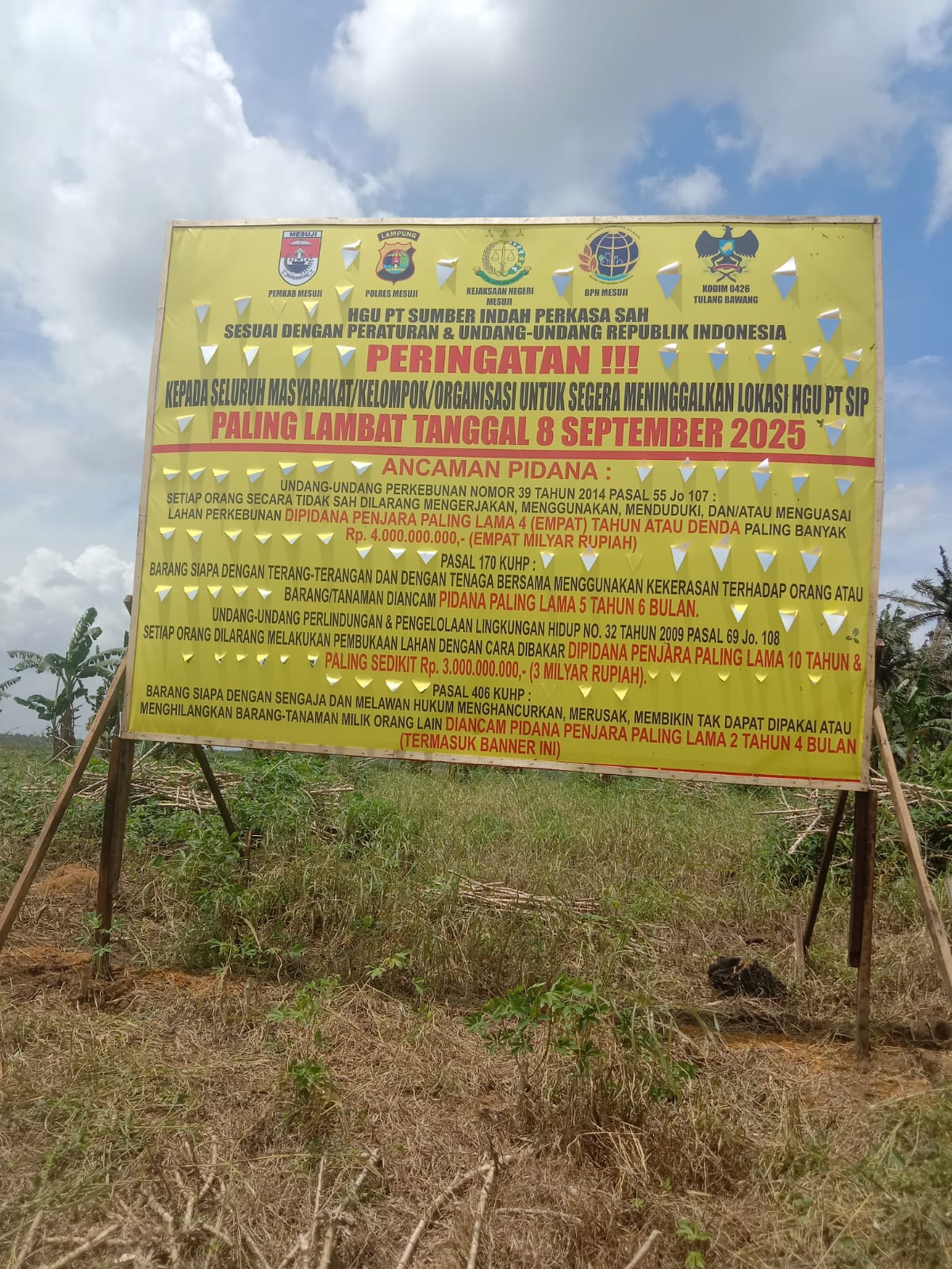 Mesuji (+62) — Ratusan keluarga di Kabupaten Mesuji terancam kehilangan tempat tinggal setelah PT Sumber Indah Perkasa (PT SIP) memasang spanduk peringatan yang memerintahkan warga segera mengosongkan lahan yang diklaim sebagai Hak Guna Usaha (HGU) perusahaan.