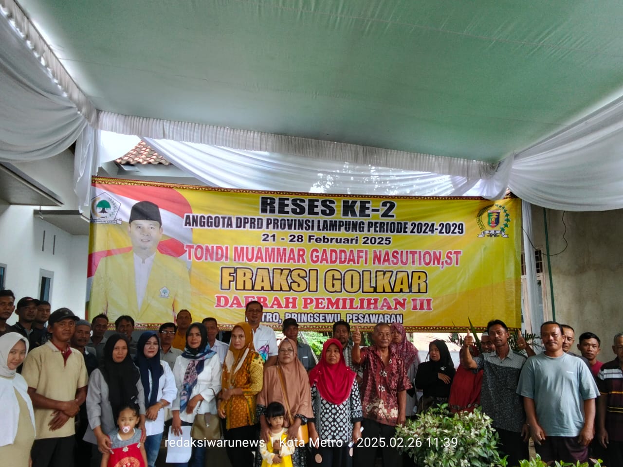 Kota Metro-(berita+62)-Anggota DPRD Provinsi Lampung, Dapil 3 (Kota Metro, Pesawaran, Pringsewu) fraksi Golkar, Tondi Muammar Gaddafi Nasution menggelar Reses ke 2, di Kelurahan Margorejo,Mulyo jati Kecamatan Metro Selatan dan metro barat tepatnya di kediaman salah satu tokoh masyarakat setempat,Bpk Iswandi dan Bpk Nuri Sebelumnya kegiatan serupa berlangsung di Kelurahan Rejomulyo dan mulyojati Reses tersebut juga akan dilanjutkan di wilayah Kelurahan Mulyojati, Kecamatan Metro Barat. Rabu, 26/02/2025.
